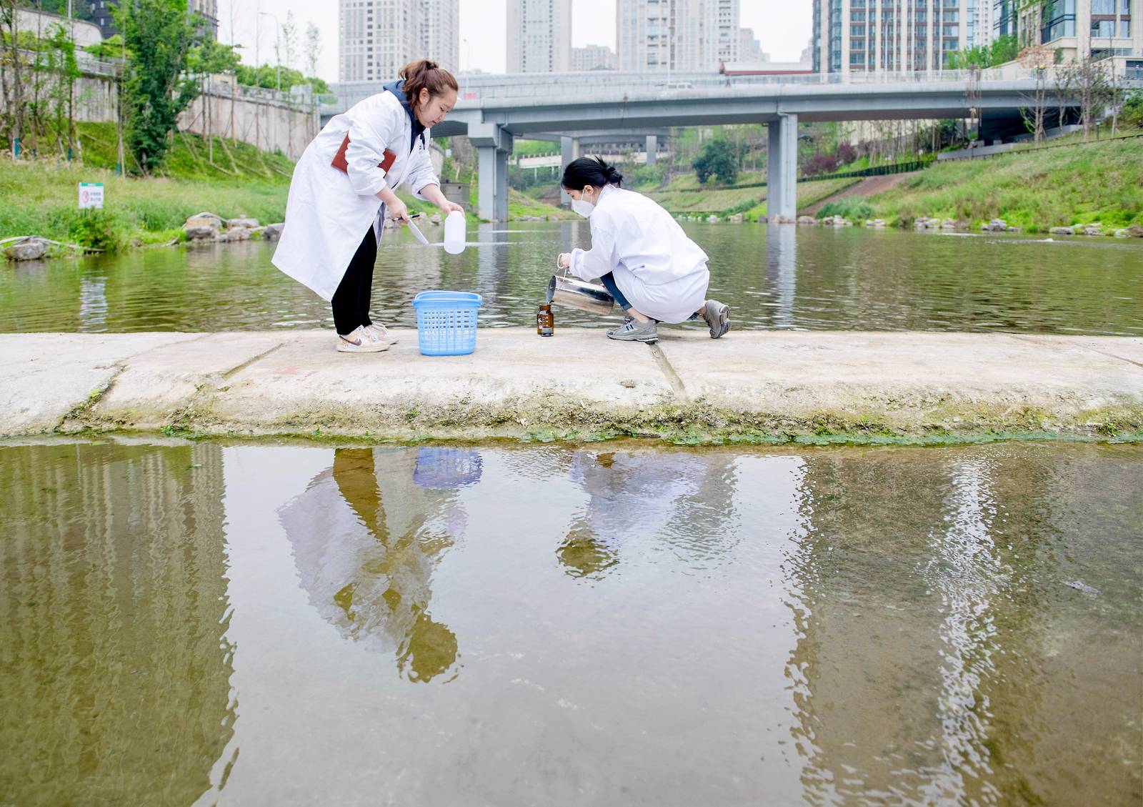 工作人员在江北区溉澜溪入江排污口进行水质监测 张锦辉 摄