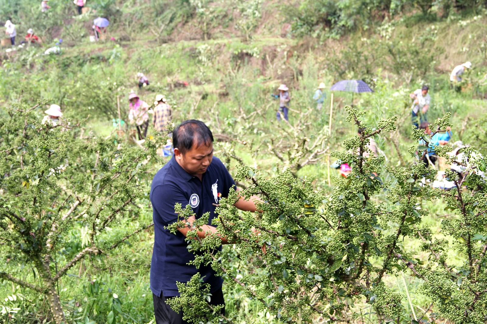 砚台镇人大代表,白云村党支部书记、村委会主任王奎与村民一道采收花椒。